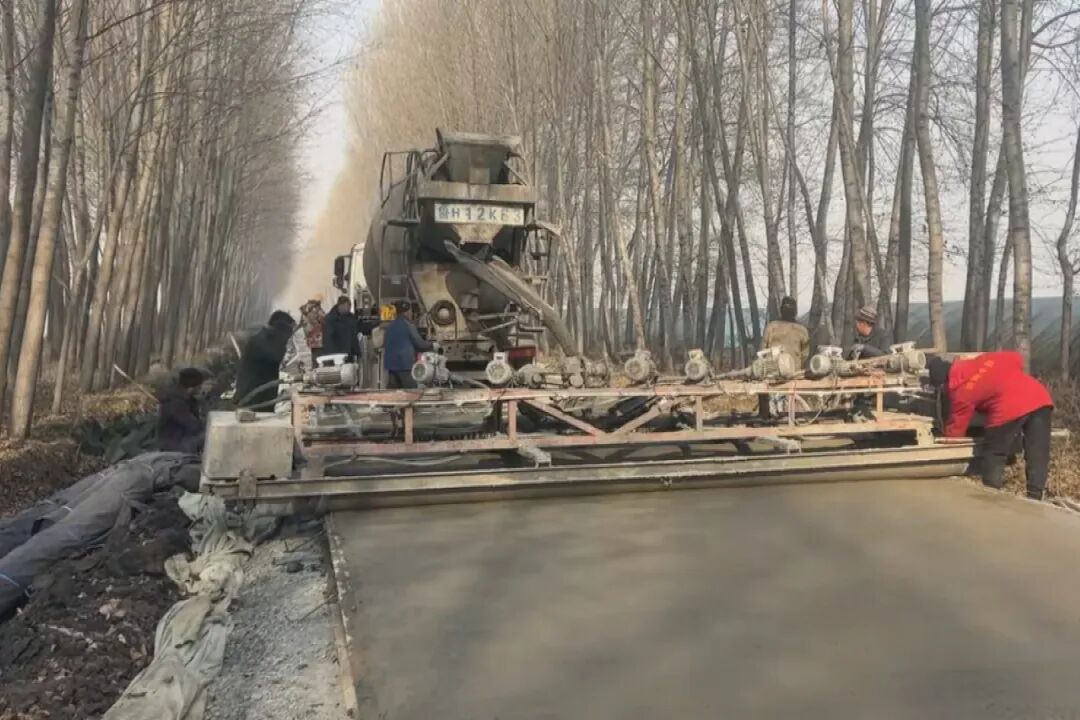 在新华乡新安村高标准农田建设现场,混凝土搅拌车往来穿梭,将一车车混凝土输送到作业区域,工作人员正对刚浇筑的路面进行平整作业。
