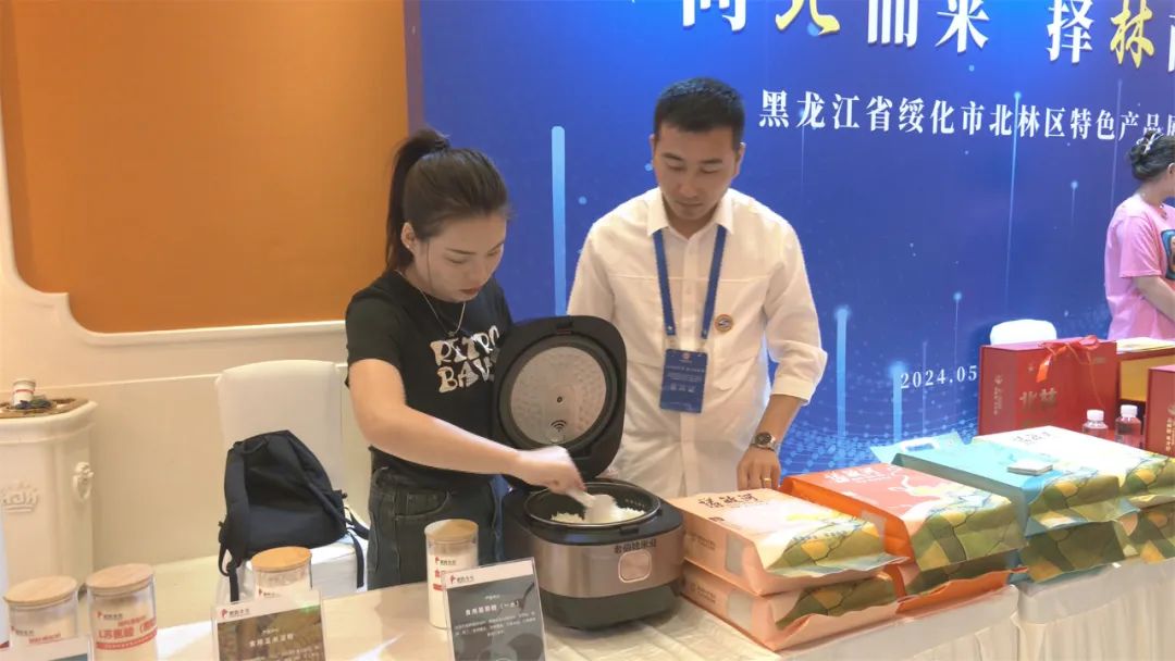 在北林香米展台前,现场焖制大米饭,米粒颗颗饱满,色泽光亮,还没开锅就已经满屋飘香,一经亮相便成为现场焦点,浓郁的米香吸引了大批观展者围观品尝。