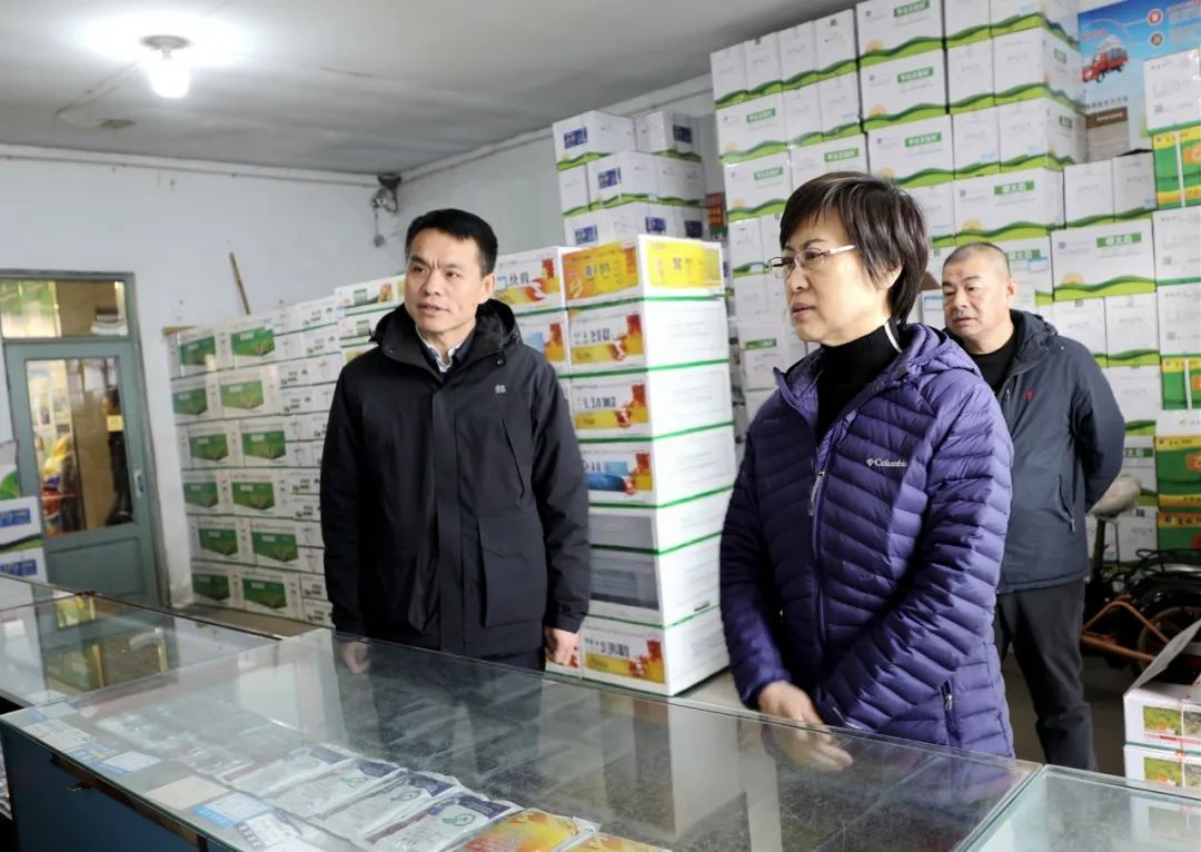 在绥化市田地源农资大市场,单伟红与经营业户、市场管理人员深入交流,详细了解农资储备、销售和市场管理情况,听取相关工作情况汇报。