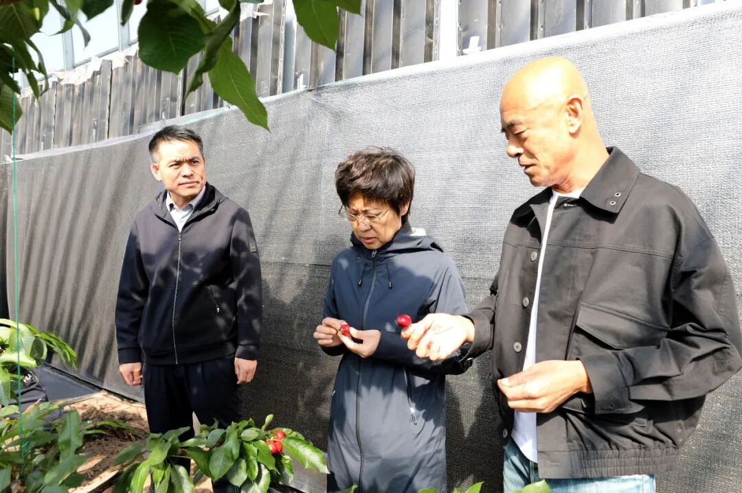 在东富镇庆广农作物种植合作社,单伟红实地察看大棚内樱桃长势,详细了解运营模式、市场销售及产业发展规划等情况。