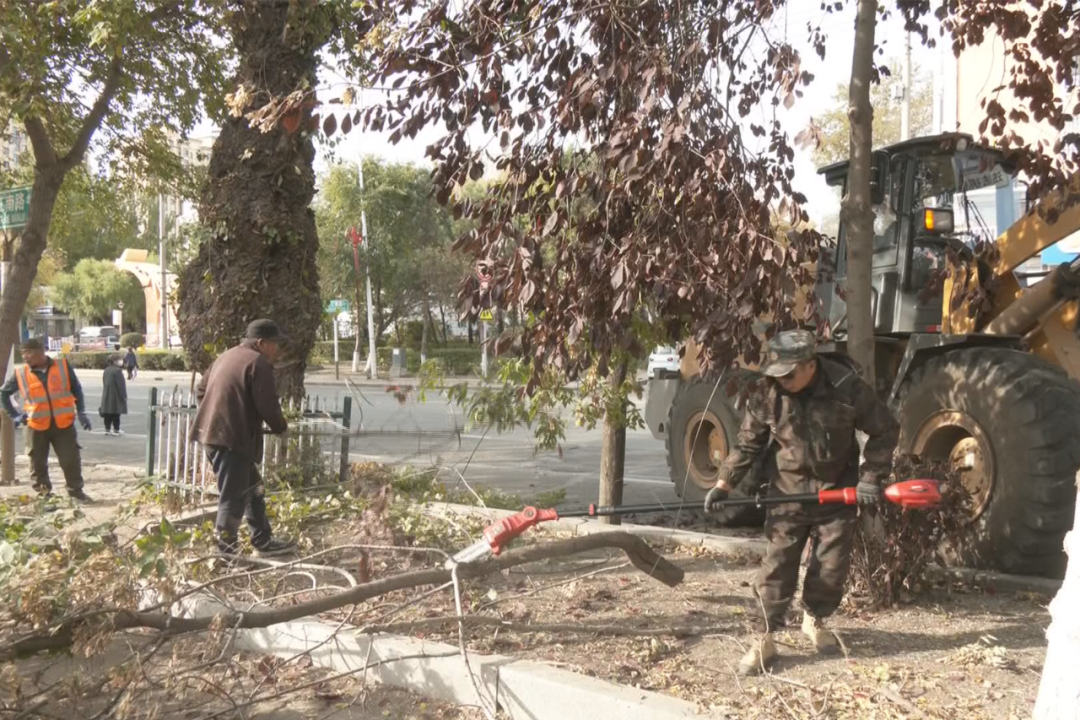 在交通繁忙的长江路路段,园林绿化工人正在抓紧作业。过长过密的树枝不仅影响行人通行,还会遮挡交通标志和路灯照明,工人们使用电锯,对道路两侧影响通行的多余树枝进行切割,并将其运往指定场地处理。