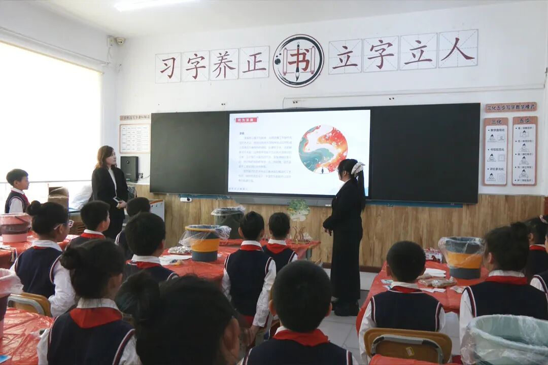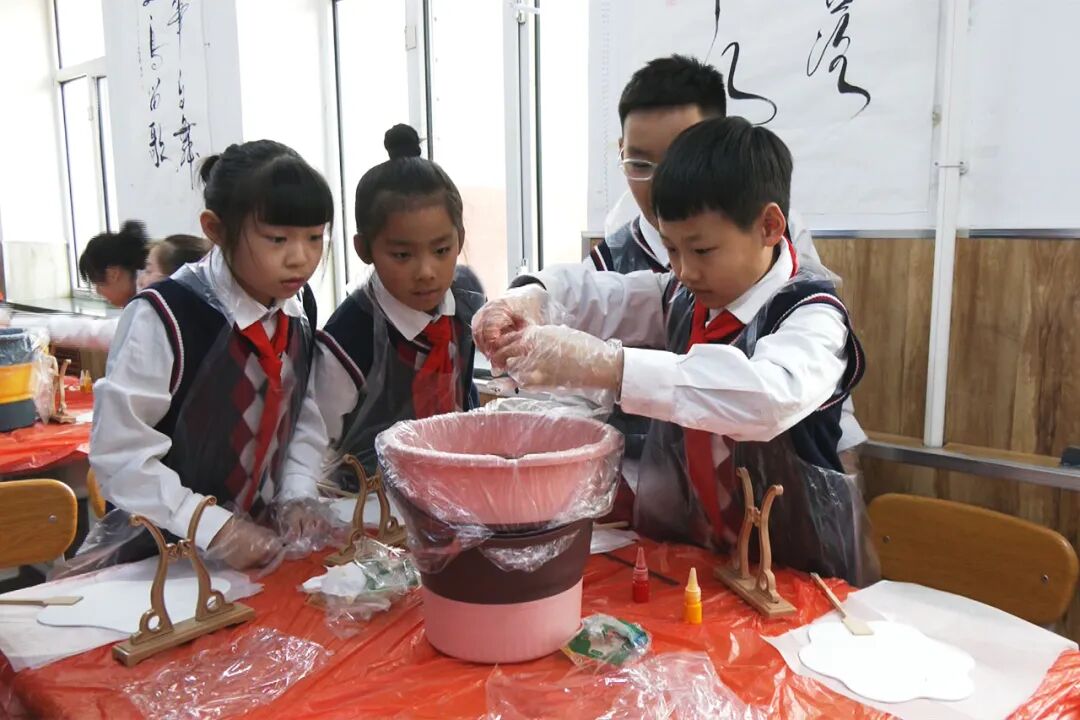 活动现场,教师用生动形象、通俗易懂的语言,为孩子们详细介绍漆扇历史和深厚的文化底蕴,并讲解制作工艺。随后,借助PPT和漆扇成品,进一步展示调漆时的比例把控、配色的巧妙搭配以及漂漆的独特手法。制作环节,孩子们纷纷动手,小心翼翼地调配颜色,大胆发挥创意,全身心投入到漆扇制作中。
