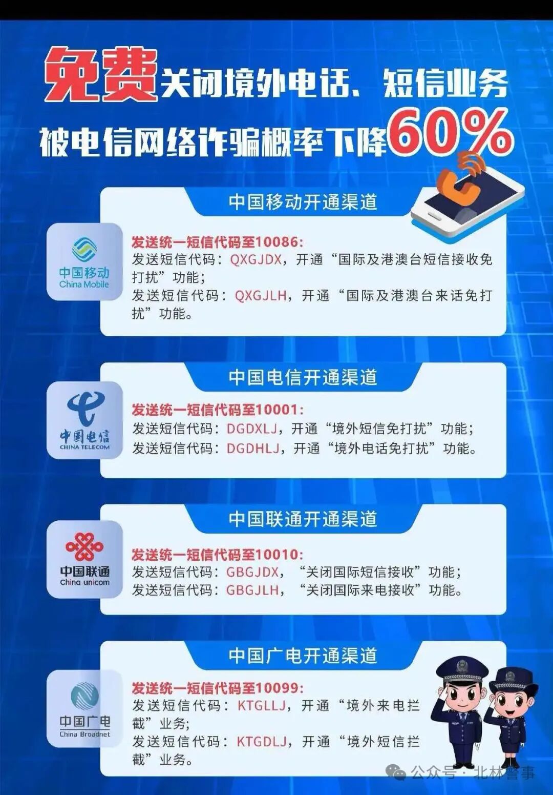 一、入户关停。从4月16日至4月30日,绥化市公安局北林分局组织全局民警辅警开展入户推动居民关停境外来电、短信服务功能专项工作,请广大居民群众在派出所民警辅警入户开展工作时给予支持配合。