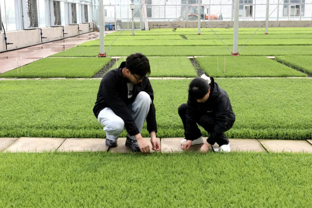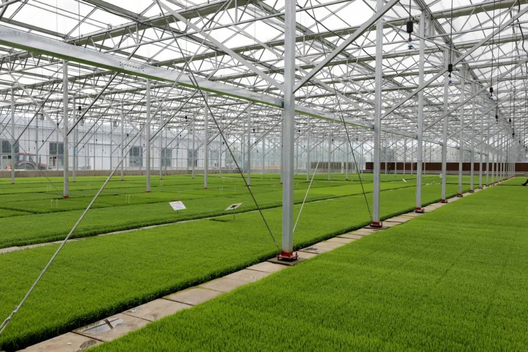 在北林区水稻大面积单产提升示范区的智能化育苗温室,棚内绿意盎然,一株株嫩绿的水稻秧苗整齐排列在育苗床上,工作人员正穿梭其间,仔细查看秧苗长势。目前,这些秧苗进入了三叶一芯期,高度也达到了14厘米,已经可以进行插秧。