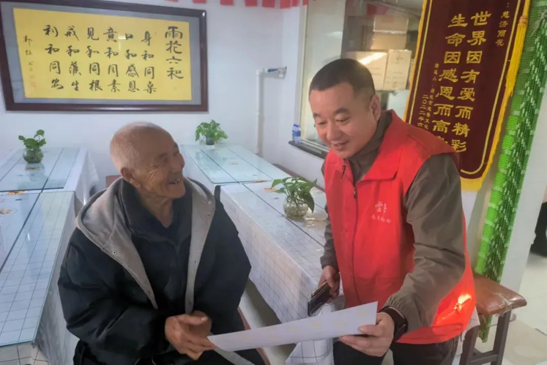 屋外是冰天雪地,但摄影志愿者们却热情不减,细心为老人调整姿态,捕捉其真挚笑容。有的耐心和老人交谈,通过语言和行动向老人传递温暖与关怀。老人们笑逐颜开,向志愿者们分享着往昔故事,并不断夸赞志愿者现场打印发放的照片。